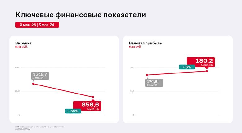 Выручка по итогам 3 месяцев 2025 года составила 856,6 млн руб., сократив значение на 34,9% к аналогичному периоду прошлого года. Как отметили представители завода, снижение выручки и себестоимости продукции, которая также уменьшилась по итогам периода, связано с ситуацией на рынке металла. Компания снизила объём закупа и перепродажи металла другим обрабатывающим предприятиям из прочих отраслей, в частности энергетической. Это решение было принято для оптимизации операционных процессов и концентрации на более перспективных направлениях.